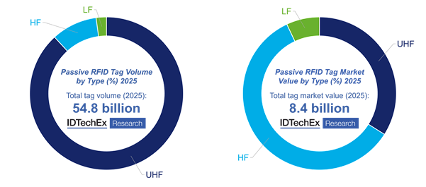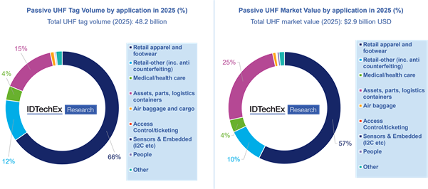 Passive UHF RFID market in 2025 by tag volume and market value. Source: “RFID 2026-2036: Forecasts, Players and Opportunities” from IDTechEx